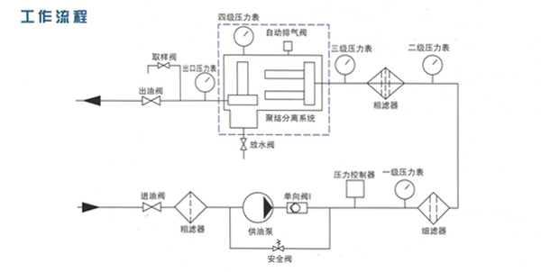被過濾的油液在供油泵的負壓驅動下首先通過粗濾器,攔大于60μm雜質,然后進入到細濾器,大于20μm的雜質被過濾掉,當油液經過精濾器時,過濾精度可達到3μm。油液經過3次過濾后,進入到聚結分離罐進行脫水處理。油液在聚結分離罐內首先通過聚結元件,聚結元件有破乳和聚結兩種功能,在通過破乳層時破掉乳化油的乳化度,使之形成游離態的油和水,在通過聚結層時,小顆粒的水聚結形成大顆粒的水,由于油、水存在比重差,因此聚結后的大顆粒水自然沉降在聚結分離罐底部的蓄水池內。未及時沉降下來的水繼續隨油液前行,在通過分離元件時,由于分離元件表層噴涂有高分子材料,對水有強大的排斥作用,因此可把水攔于分離元件之外,使之不能通過分離元件,水自然沉降到蓄水池內,從分離元件流出的油就是凈油,這就完成了對油凈化的過程。